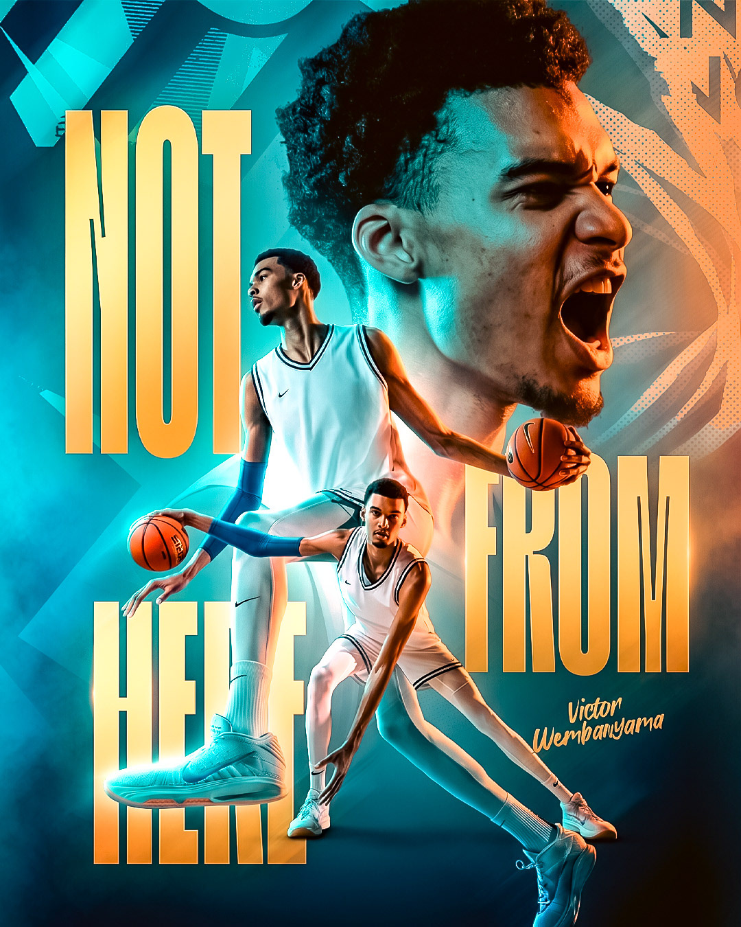 Conceptual sports design project based on Victor Wembanyama. The goal was to create a visual that communicates his unique presence and almost unreal impact on the game. Using strong contrasts, dynamic composition and bold typography, the design reinforces the idea behind the phrase “Not From Here”. Open for sports design projects.